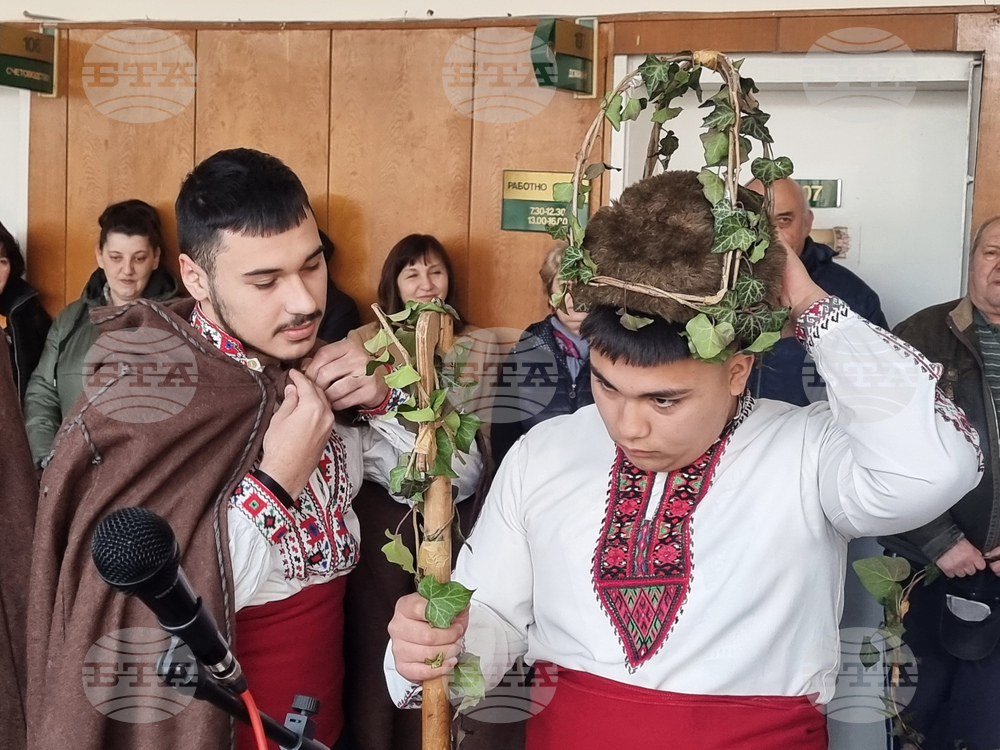 Плевен (14 февруари 2025) В Професионалната гимназия по лозарство и винарство „Александър Стамболийски“ в Плевен бе спазен ритуала по зарязване на лозята на празника Трифон Зарезан. Това извърши по традиция новоизбраният Цар на лозята, който заедно със свитата си заряза лозите в лозовите масиви на училището и отправи своите благословии за плодородна година. На снимката: Новият Цар на лозята Кристиос До получи своята корона, изплетена от пръчки бръшлян, от досегашния цар Веселин Добрев.