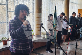 Плевен (14 февруари 2025) В Професионалната гимназия по лозарство и винарство „Александър Стамболийски“ в Плевен бе спазен ритуала по зарязване на лозята на празника Трифон Зарезан. Това извърши по традиция новоизбраният Цар на лозята, който заедно със свитата си заряза лозите в лозовите масиви на училището и отправи своите благословии за плодородна година. На снимката: директорът на гимназията Геновева Николова отправи поздрави за празника.