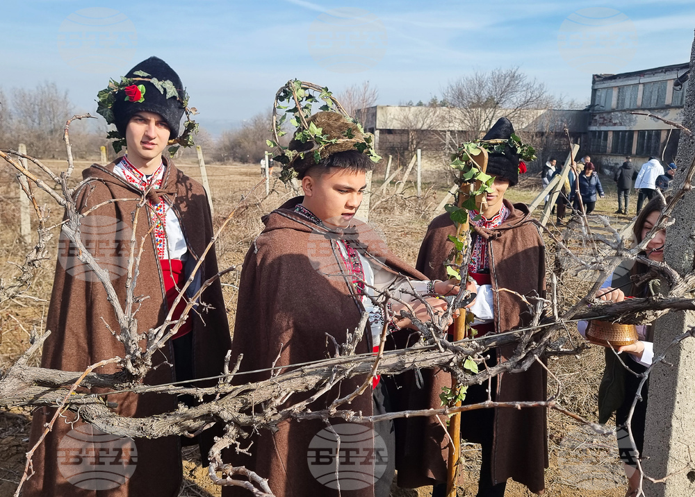 Плевен (14 февруари 2025) В Професионалната гимназия по лозарство и винарство „Александър Стамболийски“ в Плевен бе спазен ритуала по зарязване на лозята на празника Трифон Зарезан. Това извърши по традиция новоизбраният Цар на лозята, който заедно със свитата си заряза лозите в лозовите масиви на училището и отправи своите благословии за плодородна година. На снимката: