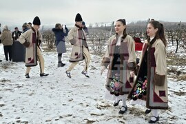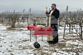 Село Рабиша (14 февруари 2025) Лозарите, технолозите и хората, които са се посветили на винопроизводството, от винарска изба „Магура“ отбелязаха своя празник на 14 февруари, когато се чества паметта на св. мъченик Трифон, покровител на лозарите и винарите. Празникът Трифон Зарезан в землището на Раяновци започна с водосвет, отслужен от свещеноиконом Рафаил - архиерейски наместник на Белоградчишка духовна околия. Кметът на Белоградчик Боян Минков взе участие в зарязването на лозята. На снимката: свещеноиконом Рафаил - архиерейски наместник на Белоградчишка духовна околия.
