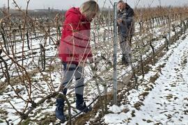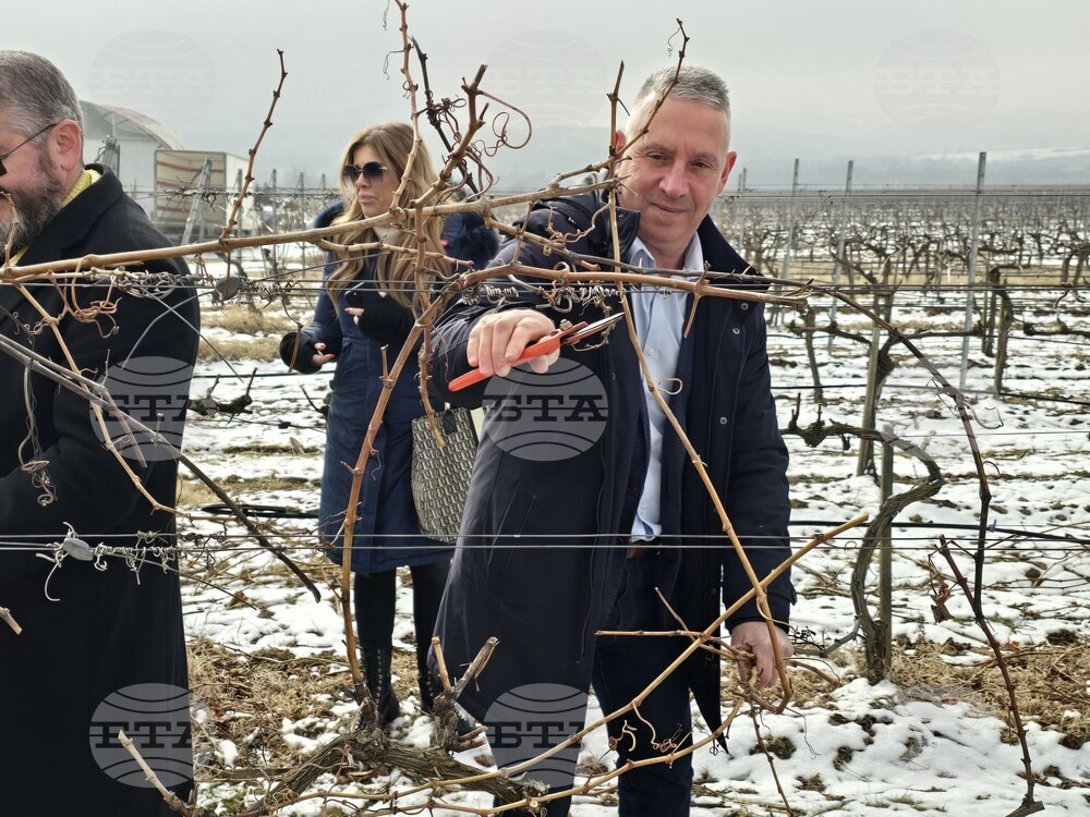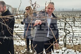Село Рабиша (14 февруари 2025) Лозарите, технолозите и хората, които са се посветили на винопроизводството, от винарска изба „Магура“ отбелязаха своя празник на 14 февруари, когато се чества паметта на св. мъченик Трифон, покровител на лозарите и винарите. Празникът Трифон Зарезан в землището на Раяновци започна с водосвет, отслужен от свещеноиконом Рафаил - архиерейски наместник на Белоградчишка духовна околия. Кметът на Белоградчик Боян Минков взе участие в зарязването на лозята. На снимката: кметът на община Белоградчик Боян Минков (вдясно).