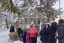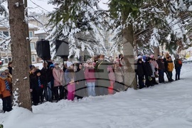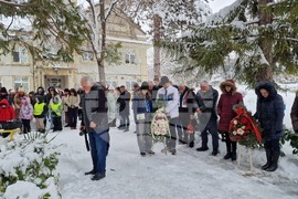Разград (19 февруари 2025) С възпоменателна церемония и масов рецитал разградчани се преклониха пред подвига и саможертвата на Васил Левски. Пред паметника на Апостола на свободата, намиращ се в двора на едноименното училище в града, отново се чуха едни от най-силните му думи, припомнени от децата от учебното заведение. На снимката 9от ляво надясно): директорът на училището Нели Стоянова, заместник - кметът на Разград Елка Неделчева