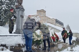 Шумен (19 февруари 2025) С възпоменателна церемония и ритуал по полагане на венци и цветя пред паметника на Васил Левски в Шумен бяха отбелязани 152 години от гибелта на Апостола на свободата. На снимката: церемонията започна с поетичен рецитал за Левски, представен от ученици от Профилираната езикова гимназия "Никола Вапцаров" в Шумен.