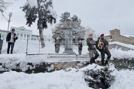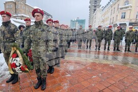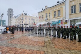 Шумен (19 февруари 2025) С възпоменателна церемония и ритуал по полагане на венци и цветя пред паметника на Васил Левски в Шумен бяха отбелязани 152 години от гибелта на Апостола на свободата. На снимката: във възпоменателната церемония се включиха представителни роти от Шуменския военен гарнизон.