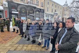 Шумен (19 февруари 2025) С възпоменателна церемония и ритуал по полагане на венци и цветя пред паметника на Васил Левски в Шумен бяха отбелязани 152 години от гибелта на Апостола на свободата. На снимката: на церемонията присъстваха областният управител на Шумен Катя Иванова (шестата отдясно на ляво), председателят на Общински съвет в града Ася Аспарухова, заместник-кметовете на община Шумен, общински съветници, представители на общинската и областната администрация, на политически, просветни и обществени организации, обществени дейци, ученици, военнослужещи и граждани.