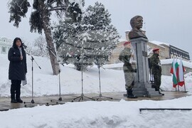 Шумен (19 февруари 2025) С възпоменателна церемония и ритуал по полагане на венци и цветя пред паметника на Васил Левски в Шумен бяха отбелязани 152 години от гибелта на Апостола на свободата. На снимката: преподавателят в Шуменския университет „Епископ Константин Преславски“ и уредник на къщата - музей „Панайот Волов“ в града д-р Милена Георгиева, в слово си по повод годишнината, припомни за живота и делото на Васил Левски.