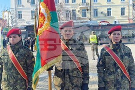 Хасково(20 февруари 2025) На площад „Свобода“ в Хасково се състоя тържествена церемония по изпращане на военнослужещи от маневрена рота в състава на регионално командване „Запад” в Стабилизиращите сили на НАТО в Косово (KFOR). Строят прие началникът на отбраната адмирал Емил Ефтимов (вляво). Молебен за здраве на военнослужещите отслужи викарият на Пловдвивския митрополит - Белоградчишкият епископ Поликарп.