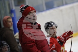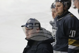 София (20 февруари 2025) Втори мач от финалните плейофи за титлата в първенството на България по хокей на лед между отборите на НСА и ЦСКА. На снимката: треньорът на НСА Станислав Кънчев.