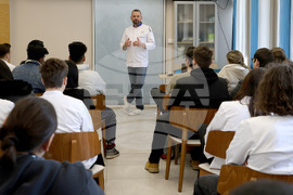 Варна (21 февруари 2025) Във Висшето училище по мениджмънт започва „Кариерни дни в туризма". В програмата е включено представяне на работодателите и предлаганите от тях работни и стажантски позиции, след което ще се проведат разговори и интервюта със заинтересованите. На снимката: лекторът Ларс Легенберг - немски готвач с над 25 години опит в кулинарната индустрия.
