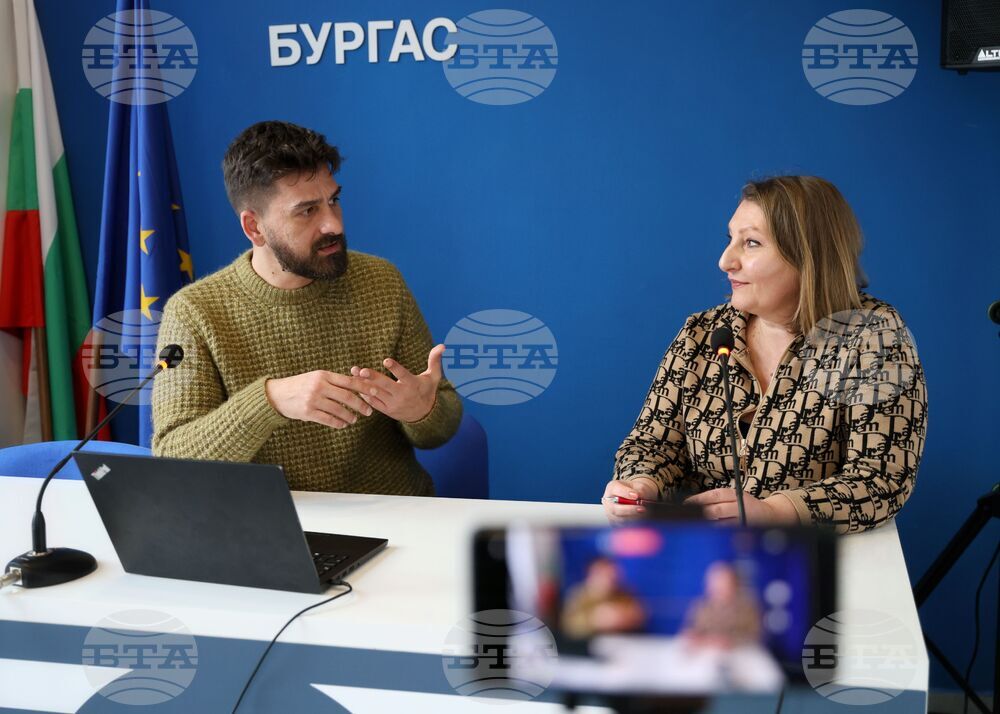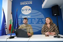 Бургас (25 февруари 2025) Националният пресклуб на Българска телеграфна агенция (БТА) в Бургас се включва с видеовръзка в представянето на новия брой на списание "ЛИК". Изданието, озаглавено „БНР 90 години по-късно“ е посветено на 90-годишнината от създаването на Българското национално радио (БНР). На снимката: кореспондентът на БТА в Бургас Станимир Димитров и главният редактор на БНР-Бургас Петя Янакиева.