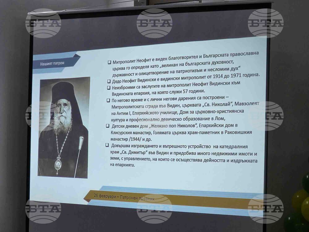 Видин (26 февруари 2025) Частното начално училище „Митрополит Неофит Видински” отбелязва своя патронен празник. Днес се навършват 54 години от смъртта на Видинския митрополит Неофит, чието име носи учебното заведение. То е създадено като съвместна инициатива на Видинската митрополия и Фондация „Частно начално училище митрополит Неофит Видински“. На снимката: Видинският митрополит Пахомий.