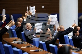 София (27 февруари 2025) Заседанието на парламента започна с декларация на „Възраждане“, мнозинството от депутатите отново напуснаха залата. Вътре останаха само парламентарните групи на „Възраждане“ и „Морал, единство, чест“. На снимката: депутати на „Възраждане“ държат плакати в пленарната зала.
