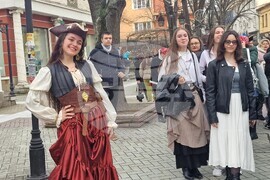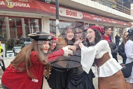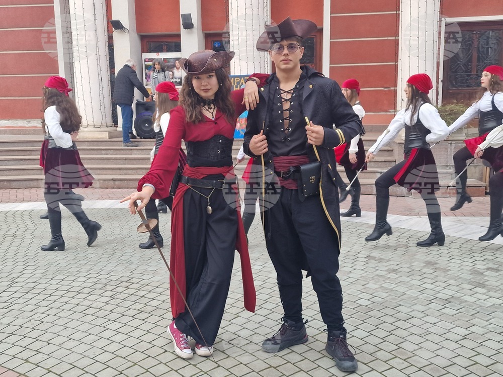 Хасково (27 февруари 2025) За 54-ти път в Хасково се проведе Карнавалът фашинг на Езиковата гимназия „Проф. д-р Асен Златаров“. Тази година темата, избрана от принцът и принцесата на пъстрото шествие е „Пиратска нощ – легендата започва“. Празникът се организира всяка година по това време от единадесетокласниците в паралелките с изучаване на немски език. На снимката: директорът на езиковата гимназия Диян Янев (вляво) също се включи в карнавала.