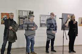 Плевен (27 февруари 2025) Ученици от Националното училище по изкуствата (НУИ) „Панайот Пипков“ в Плевен откриха изложба в Арт центъра в града. На снимката: Валентин Асенов - Хъкъла (втори отляво), директорът на училището Румен Тодоров (втори отдясно) и началникът на отдел „Култура и туризъм“ в Община Плевен Анелия Дечева (вдясно).