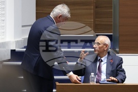 София (5 март 2025) Парламентът обсъжда на първо четене Законопроекта за държавния бюджет на Република България за 2025 г. В пленарната зала са министри от кабинета и представители на съдебната власт. На снимката: министърът на правосъдието Георги Георгиев (вляво), министърът на финансите Теменужка Петкова (вдясно).