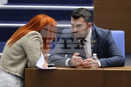 София (5 март 2025) Парламентът обсъжда на първо четене Законопроекта за държавния бюджет на Република България за 2025 г. В пленарната зала са министри от кабинета и представители на съдебната власт. На снимката: председателят на Народното събрание Наталия Киселова (вляво), депутатът от парламентарната група „Продължаваме Промяната - Демократична България" Мартин Димитров.