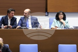 София (5 март 2025) Парламентът обсъжда на първо четене Законопроекта за държавния бюджет на Република България за 2025 г. В пленарната зала са министри от кабинета и представители на съдебната власт. На снимката: министърът на туризма Мирослав Боршош (вляво), министърът на правосъдието Георги Георгиев (в средата), министърът на финансите Теменужка Петкова (вдясно).