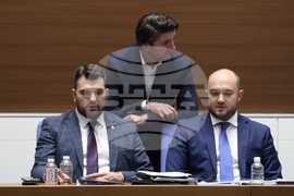 София (5 март 2025) Парламентът обсъжда на първо четене Законопроекта за държавния бюджет на Република България за 2025 г. В пленарната зала са министри от кабинета и представители на съдебната власт. На снимката (от ляво надясно): министърът на външните работи на Република България Георг Георгиев, министърът на туризма Мирослав Боршош, министърът на правосъдието Георги Георгиев.
