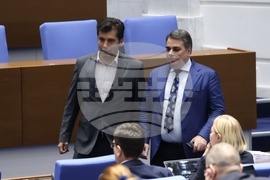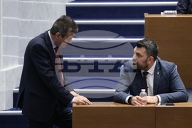 София (5 март 2025) Парламентът обсъжда на първо четене Законопроекта за държавния бюджет на Република България за 2025 г. В пленарната зала са министри от кабинета и представители на съдебната власт. На снимката: народните представители от парламентарната група „Продължаваме Промяната - Демократична България" Кирил Петков (вляво), Асен Василев (вдясно).