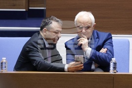 София (5 март 2025) Парламентът обсъжда на първо четене Законопроекта за държавния бюджет на Република България за 2025 г. В пленарната зала са министри от кабинета и представители на съдебната власт. На снимката: министърът на здравеопазването Силви Кирилов (вляво), министърът на отбраната Атанас Запрянов (вдясно).