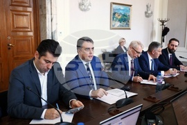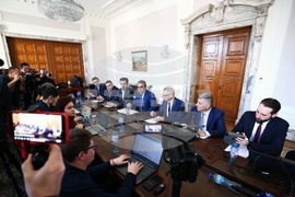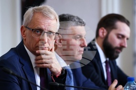 София (6 март 2025) Представители на партия „Продължаваме Промяната” дават пресконференция на тема „Истината за Плана за възстановяване и устойчивост”. На снимката (от ляво надясно): Николай Денков, Андрей Цеков и Петър Кьосев.