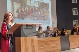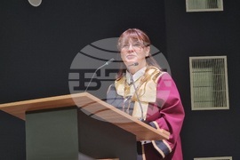 Плевен (7 март 2025) В Медицинския университет в Плевен дипломи бяха връчени на 63-ма магистър-фармацевти от четвъртия випуск на Факултет „Фармация“. Тържествената церемония се състоя в новоизградената аудитория „Юбилеаре“. На снимката: гост на церемонията бе заместник-председателят на Българския фармацевтичен съюз магистър-фармацевт Велина Григорова.