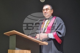 Плевен (7 март 2025) В Медицинския университет в Плевен дипломи бяха връчени на 63-ма магистър-фармацевти от четвъртия випуск на Факултет „Фармация“. Тържествената церемония се състоя в новоизградената аудитория „Юбилеаре“. На снимката: пожелания към магистър-фармацевтите отправи председателят на Общинския съвет в Плевен доц. д-р Иван Малкодански.
