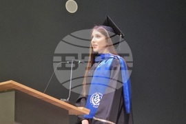 Плевен (7 март 2025) В Медицинския университет в Плевен дипломи бяха връчени на 63-ма магистър-фармацевти от четвъртия випуск на Факултет „Фармация“. Тържествената церемония се състоя в новоизградената аудитория „Юбилеаре“. На снимката: от името на дипломантите към академичното ръководство на университета и преподавателите се обърна отличникът на випуска магистър-фармацевт Марионита Влахова.