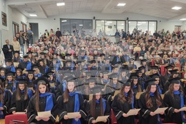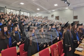Плевен (7 март 2025) В Медицинския университет в Плевен дипломи бяха връчени на 63-ма магистър-фармацевти от четвъртия випуск на Факултет „Фармация“. Тържествената церемония се състоя в новоизградената аудитория „Юбилеаре“. На снимката: магистър-фармацевтите бяха поздравени от певицата Ралица Хайдърска.