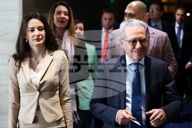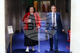 София (28 май 2025) Депутати влизат в пленарната зала преди редовно заседание на Народното събрание. На снимката: депутатите от Парламентарна група "Движение за права и свободи – Ново начало" – ДПС – Ново начало Небие Църенска и Йордан Цонев (вдясно).