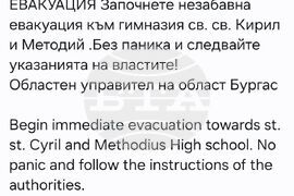 Средец (24 юли 2025) Започна евакуация на жителите на град Средец (Община Средец, Област Бургас). Причината е продължаващият пожар в цех за пластмасови изделия на входа на града и силно замърсеният въздух. Хората са уведомени със съобщение в системата BG-Alert (на снимката). Това е второто съобщение за деня, което системата изпраща. По-рано жителите бяха уведомени за опасно замърсяване на въздуха.