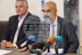 Варна (16 септември 2025) Членове на коалицията „Продължаваме промяната - Демократична България" във Варна дават пресконференция, с която призовават гражданите да излязат отново утре на протест срещу задържането на кмета Благомир Коцев в ареста. Началото на протеста ще бъде от 18,30 ч. пред сградата на Общината в града. На снимката: Антон Тонев и изпълняващият функциите кмета на Варна Павел Попов (вдясно).