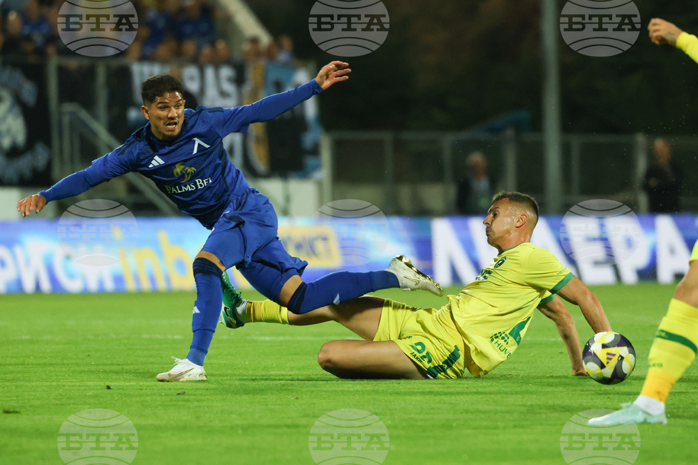 София (19 септември 2025) Футболна среща от девети кръг на Efbet лига се провежда между отборите на Левски и Лудогорец на стадион " Георги Аспарухов ". На снимката: Защитникът на Левски Майкон (вляво) и халфът на Лудогорец Педро Нареси (вдясно).