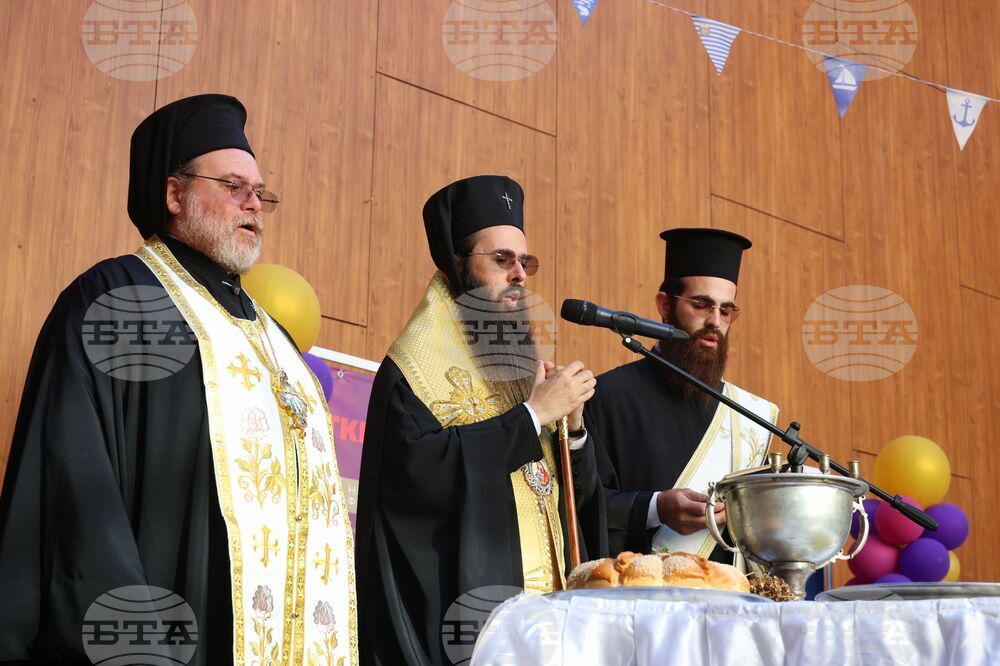 Бургас (23 септември 2025) В Културен дом „НХК“ се провежда церемония по откриване на Филиал Бургас на Националната академия за театрално и филмово изкуство (НАТФИЗ) „Кръстьо Сарафов“ и откриване на новата учебна година. Събитието включва представяне на екипа, който ще преподава в Бургас, тържествен водосвет и музикална програма. На снимката: водосвет отслужва Негово Високопреосвещенство Сливенският митрополит Арсений (в средата).