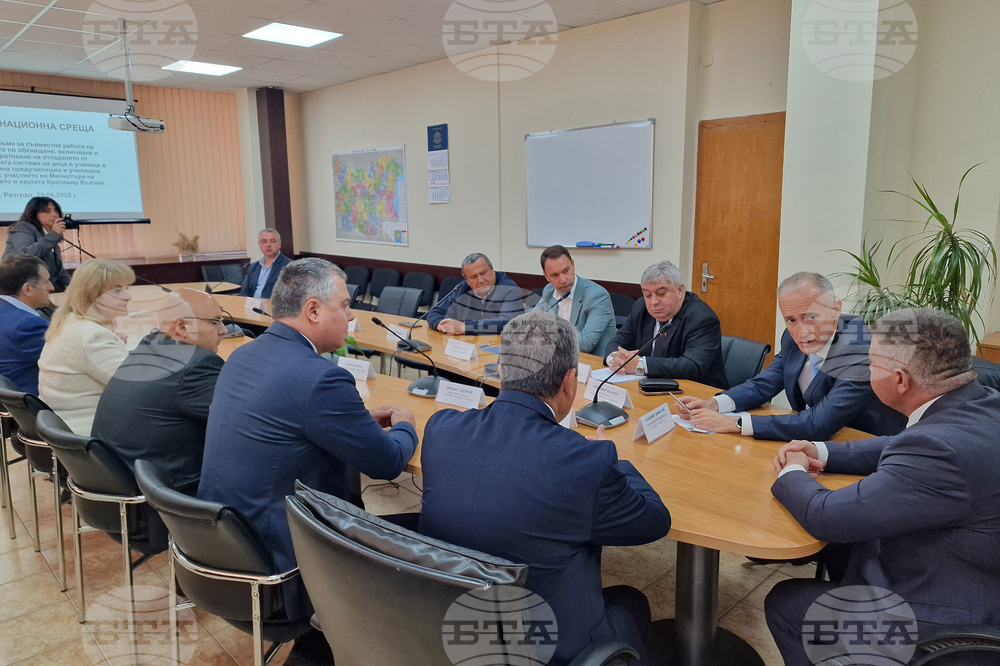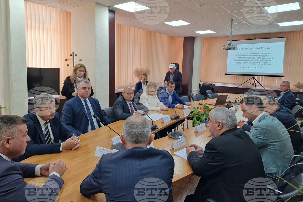 Разград (29 септември 2025) Министърът на образованието и науката Красимир Вълчев (втори отдясно) участва в координационна среща по механизма при Областния управител на област Разград. В рамките на посещението си министър Вълчев се срещна с екипа на Регионалното управление на образованието (РУО) в Разград тази сутрин. Предстои министърът да посети Основно училище „Васил Левски“, Спортен център „Лудогорец“, Профилираната природоматематическа гимназия „Академик Никола Обрешков“, Националната професионална техническа гимназия „Шандор Петьофи“, където ще участва в работна среща с директори на образователни институции и учители от област Разград.