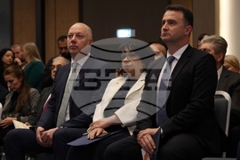 София (30 септември 2025) в хотел "Хилтън“ се провежда национална конференция „Компас 2025“ с акцент върху големите проекти в българската енергетика, разглеждани през призмата на геополитиката, националната сигурност и дипломацията. На снимката (от ляво надясно): министърът на енергетиката Жечо Станков и министърът на финансите Теменужка Петкова и заместник-министърът на външните работи Николай Павлов.