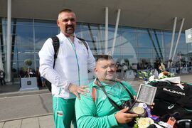 София (30 септември 2025) На Летище "Васил Левски" пристигна световния шампион от първенството по лека атлетика за параолимпийци Ружди Ружди. На снимката: треньорът на паралимпийския шампион Радостин Тодоров и шампион от първенството по лека атлетика за параолимпийци Ружди Ружди (вдясно).