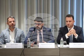 София (30 септември 2025) Кръгла маса „Ускорен енергиен преход: Политики и иновации за устойчиво развитие до 2040 г.”, се провежда в столичния „Гранд Хотел Милениум”. На снимката (от ляво надясно): председателят на парламентарната Комисия по бюджет и финанси Делян Добрев, директорът на Програма „Енергетика и климат” в Центъра за изследване на демокрацията Мартин Владимиров и министърът на енергетиката Жечо Станков.