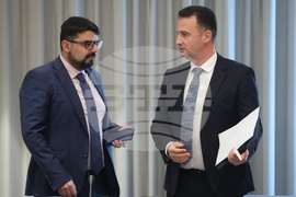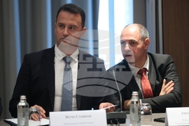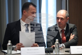 София (30 септември 2025) Кръгла маса „Ускорен енергиен преход: Политики и иновации за устойчиво развитие до 2040 г.”, се провежда в столичния „Гранд Хотел Милениум”. На снимката (от ляво надясно): директорът на Програма „Енергетика и климат” в Центъра за изследване на демокрацията Мартин Владимиров и министърът на енергетиката Жечо Станков.