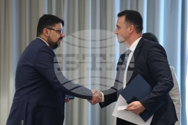 София (30 септември 2025) Кръгла маса „Ускорен енергиен преход: Политики и иновации за устойчиво развитие до 2040 г.”, се провежда в столичния „Гранд Хотел Милениум”. На снимката (от ляво надясно): министърът на енергетиката Жечо Станков и изпълнителният директор на Електроенергийния системен оператор Ангелин Цачев.