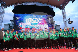 София (30 септември 2025) Посрещане на волейболистите от Националния отбор на България, които спечелиха сребърни медали на шампионата на планетата във Филипините, се провежда на площада пред храм-паметник „Свети Александър Невски”. На снимката: президентът на Българската федерация по волейбол (БФВ) Любомир Ганев (вдясно).