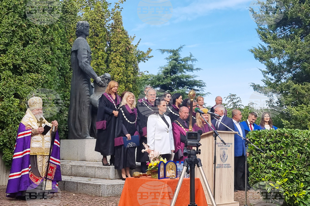 Велико Търново (1 октомври 2025) Във Великотърновския университет тържествено се открива новата учебна година. Ректорът проф. Димитър Димитров отправи приветствие към новите над 3700 първокурсници, към всички студенти и към академичния състав. Великотърновския митрополит Григорий отслужи водосвет. Областният управител Юлия Ликоманова-Мутафчиева връчи празничен букет на първокурсничка и пожела на добър час на всички в науката и в живота.
