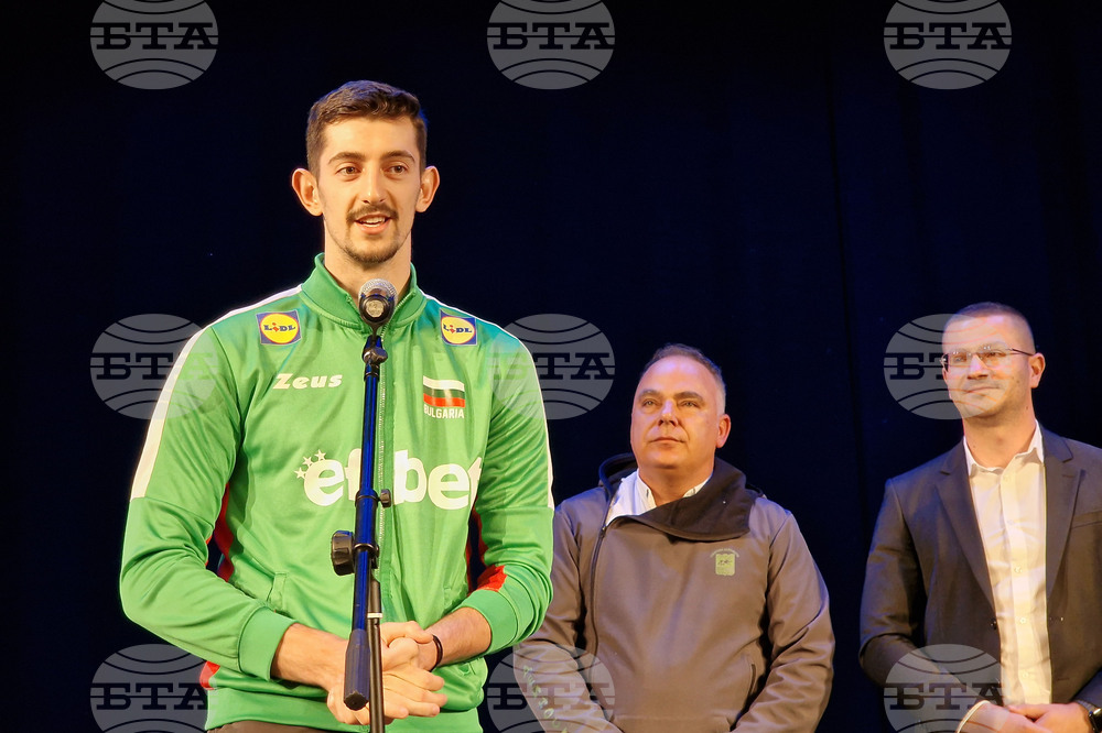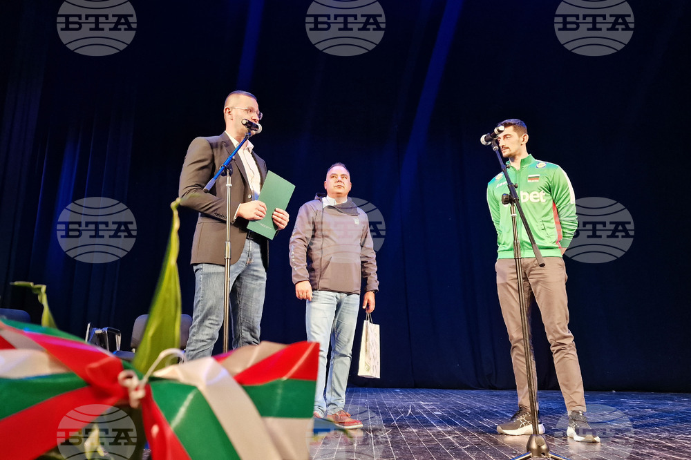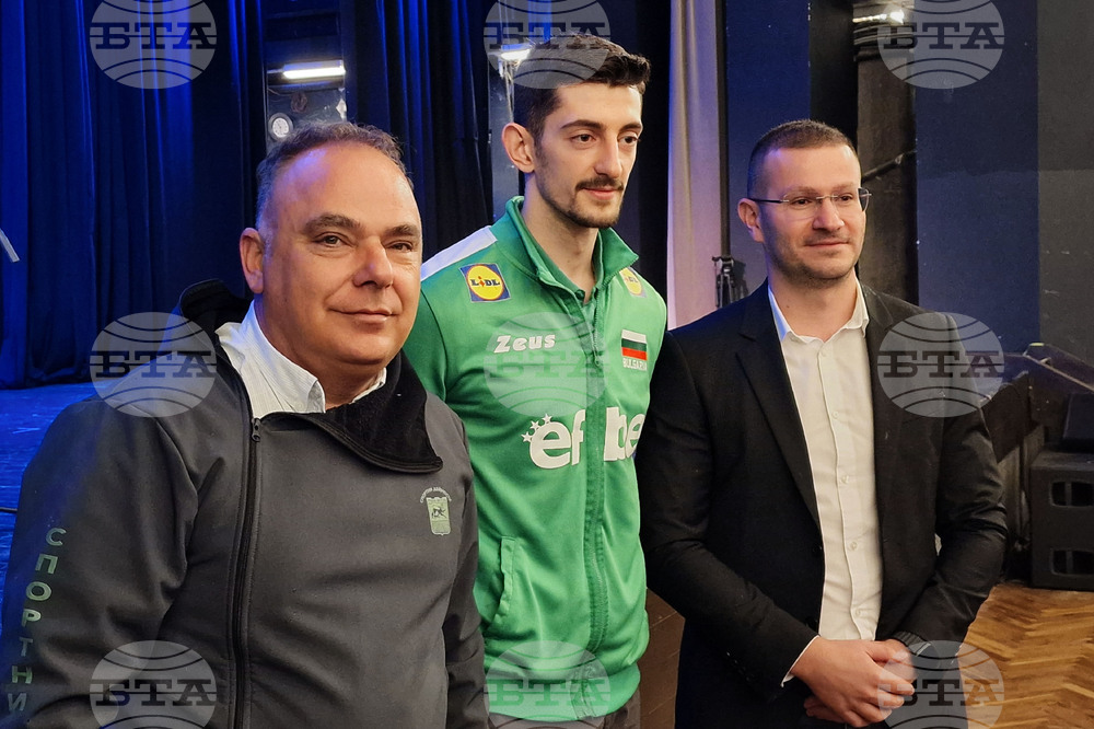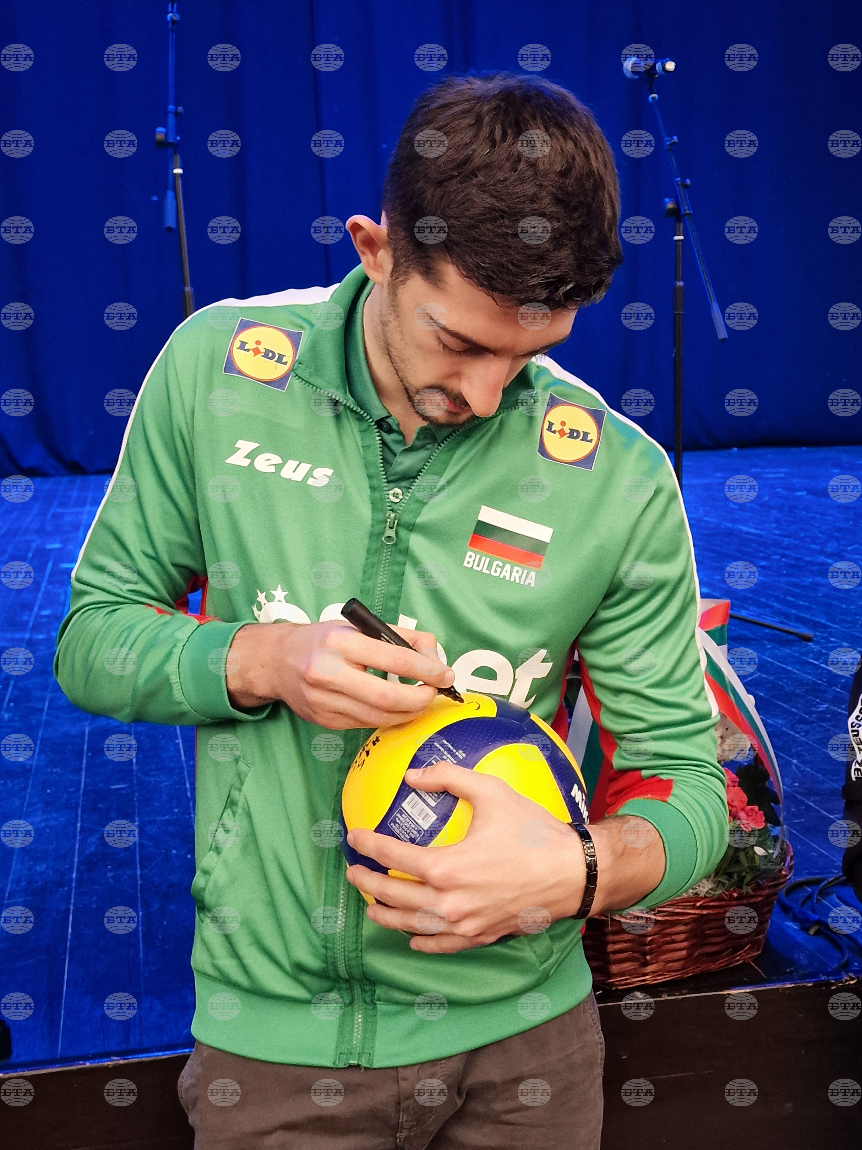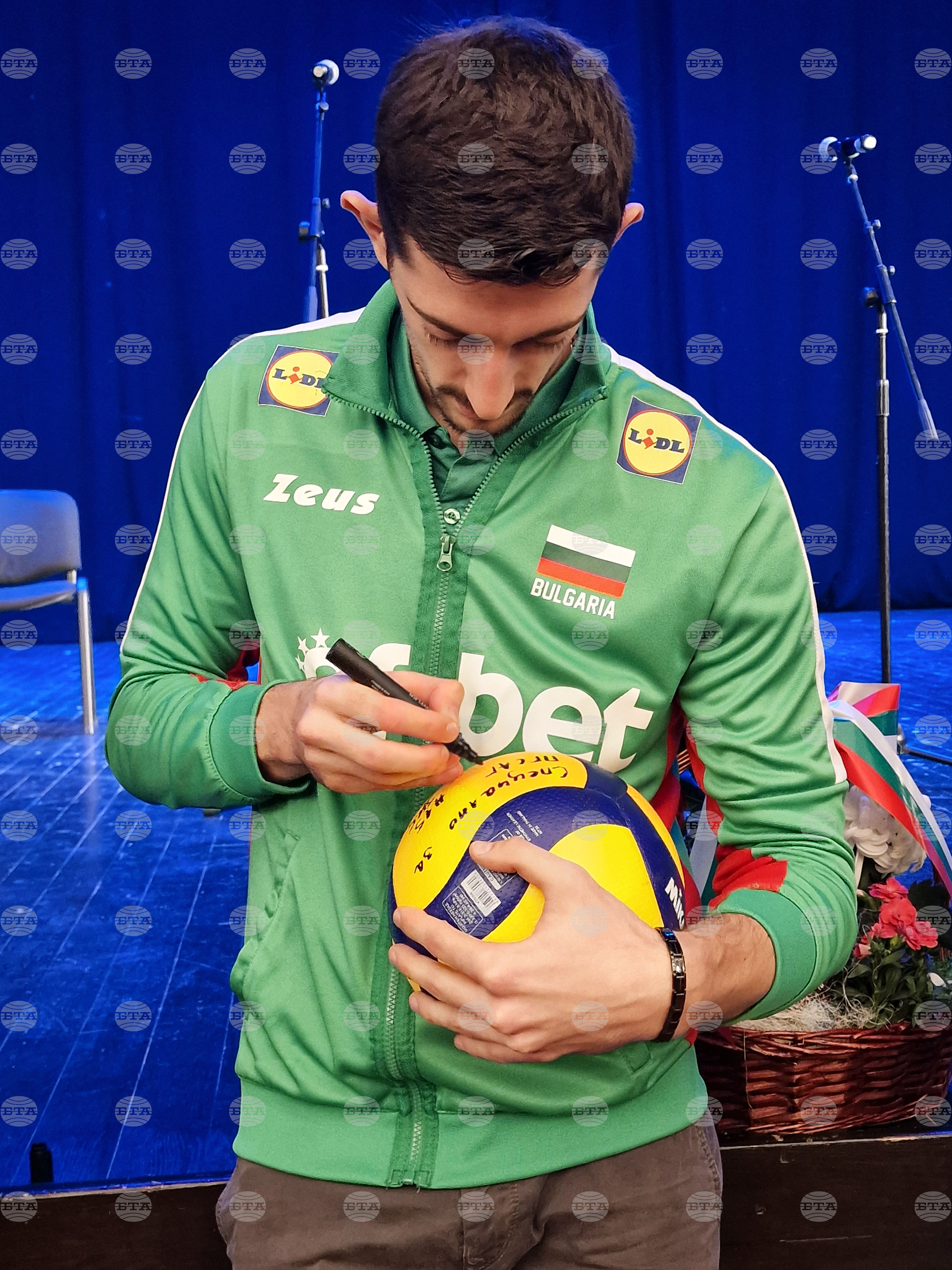 Стара Загора (3 октомври 2025) Ръководството на Професионалната гимназия по строителство, архитектура и геодезия (ПГСАГ) „Лубор Байер“ организира среща в Културен дом - Стара Загора с Руси Желев - вицешампион по волейбол от Световното първенство във Филипините през 2025 г., който е възпитаник на професионалната гимназия. На снимката (от ляво надясно): началник отдел „Спортни дейности" към Община Стара Загора Петко Крумов, волейболистът Руси Желев и заместник-кметът на Община Стара Загора арх. Мартин Паскалев.