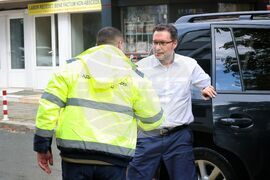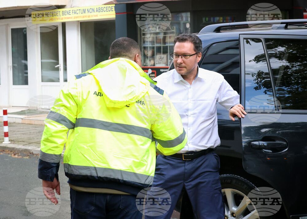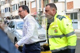 Несебър (3 октомври 2025) Представители на различни институции, от сформирания кризисен щаб относно наводненията и усложнената обстановка след проливните дъждове в Област Бургас, провеждат заседание в сградата на Община Несебър. На снимката: министърът на вътрешните работи Даниел Митов (вляво) и областният управител на Бургас Владимир Крумов (вдясно).