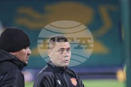 София (10 октомври 2025) Футболистите от националния отбор на България провеждат официална тренировка преди срещата от група Е на световните квалификации срещу отбора на Турция. На снимката: селекционерът на отбора Александър Димитров (вдясно).