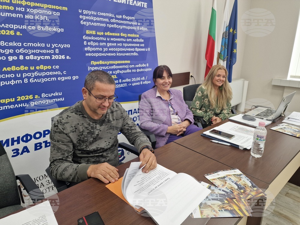 Завет (13 октомври 2025) Провежда се информационна среща, която е част от Националната информационна кампания за въвеждане на еврото в България. Инициативата се организира от Комисията за защита на потребителите (КЗП). На снимката (от ляво надясно): експертът от териториалния отдел на КЗП в Русе Павел Кръстев, директорът на Офис Разград - Териториална дирекция на НАП Варна Цанка Тъмнишка и главният експерт в звено "Комуникации" в Териториална дирекция във Варна на НАП Лора Георгиева.