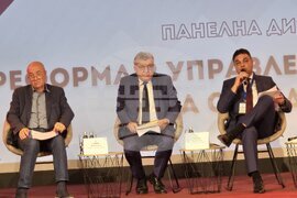Албена (13 октомври 2025) Дискусионен панел "Реформа в управлението на отпадъците" се провежда в зала Перуника в Албена. В срещата участва министърът на околната среда и водите. На снимката (от ляво надясно ): изпълнителният директор на „Екобулпак“ - Видьо Видев, министърът на околната среда и водите Манол Генов, заместник– председателят на Управителен съвет на НСОРБ и кмет на община Димитровград - Иво Димов.