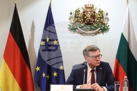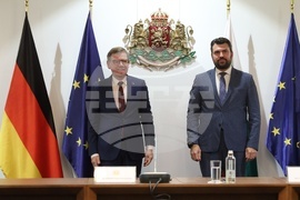 София (13 октомври 2025) Министърът на външните работи Георг Георгиев дава изявление за медиите след срещата си с германския му колега Йохан Вадефул в резиденция „Бояна“. На снимката: посланикът на Федерална Република Германия в България Ирене Планк.