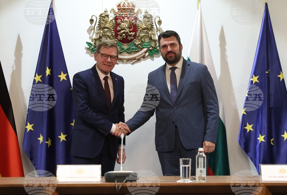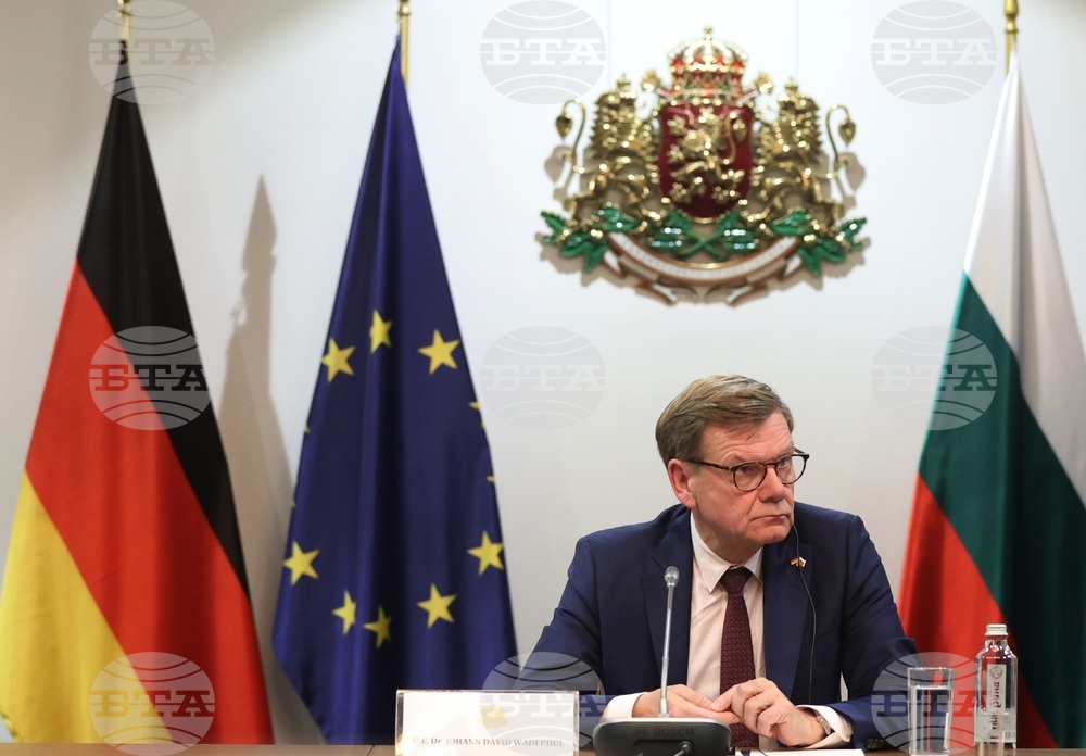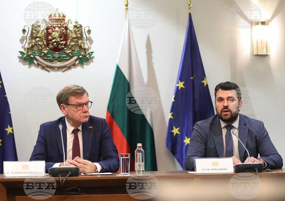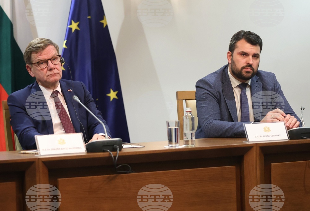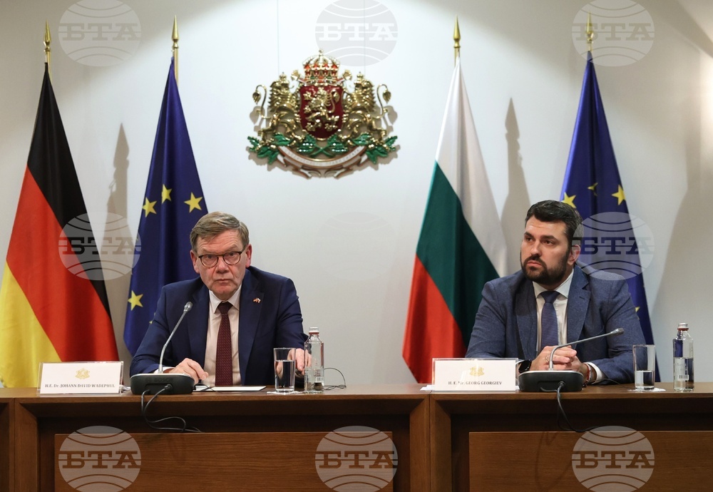 София (13 октомври 2025) Министърът на външните работи Георг Георгиев (вдясно) дава изявление за медиите след срещата си с германския му колега Йохан Вадефул (вляво) в резиденция „Бояна“.