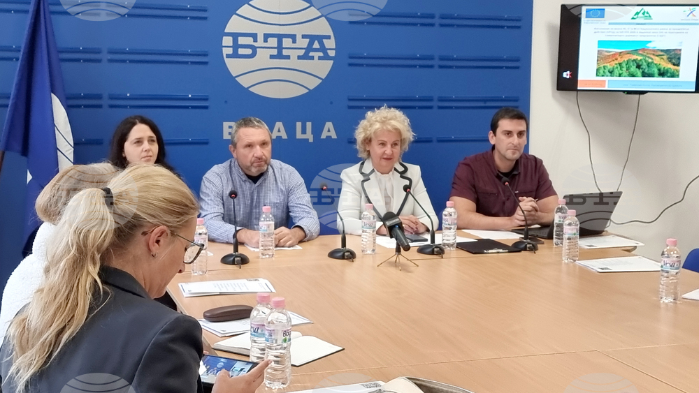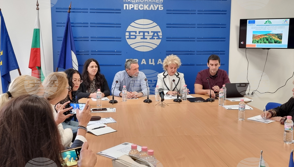 Враца (14 октомври 2025) Северозападното държавно предприятие (СЗДП) Враца изпълнява проект, по който ще се извършват дейности за подпомагане на гората в нейното естествено израстване и регулиране на видовия й състав, обяви днес на пресконференция в Националния пресклуб на БТА във Враца директорът на предприятието инж. Ваня Каменова. Проектът „Изпълняване на мерки 46, 47 и 48 от Националната рамка за приоритетни действия за Натура 2000 в защитените зони на територията на СЗДП Враца“ се реализира по програма „Околна среда 2021 – 2027“ и е на обща стойност над 6,699 млн. лв. без ДДС, като европейското финансиране е над 5,949 лева. На снимката (от ляво надясно): инж. Александрина Чевелекова, инж. Цветан Цветков, директорът на СЗДП Враца инж. Ваня Каменова и ръководителят на проекта инж. Томислав Колов.